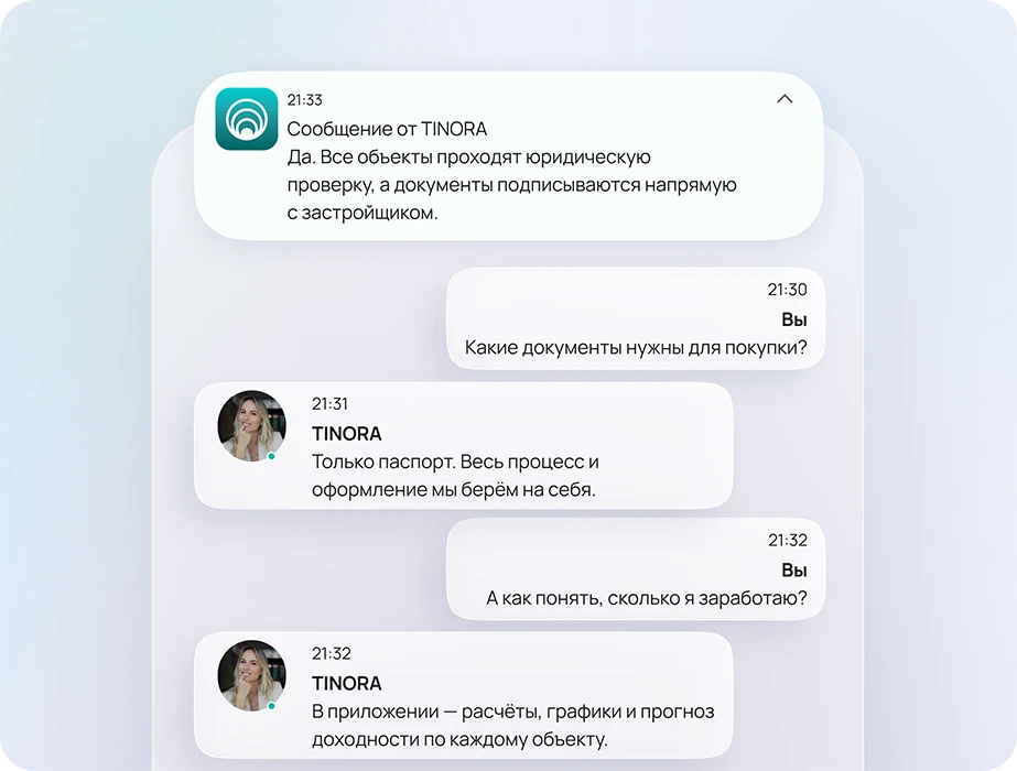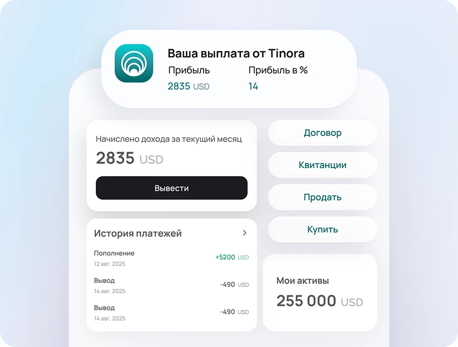 Все этапы, документы и аналитика — в приложении TINORA: личный кабинет, статус сделок, отчёты и связь с экспертами — в один клик.